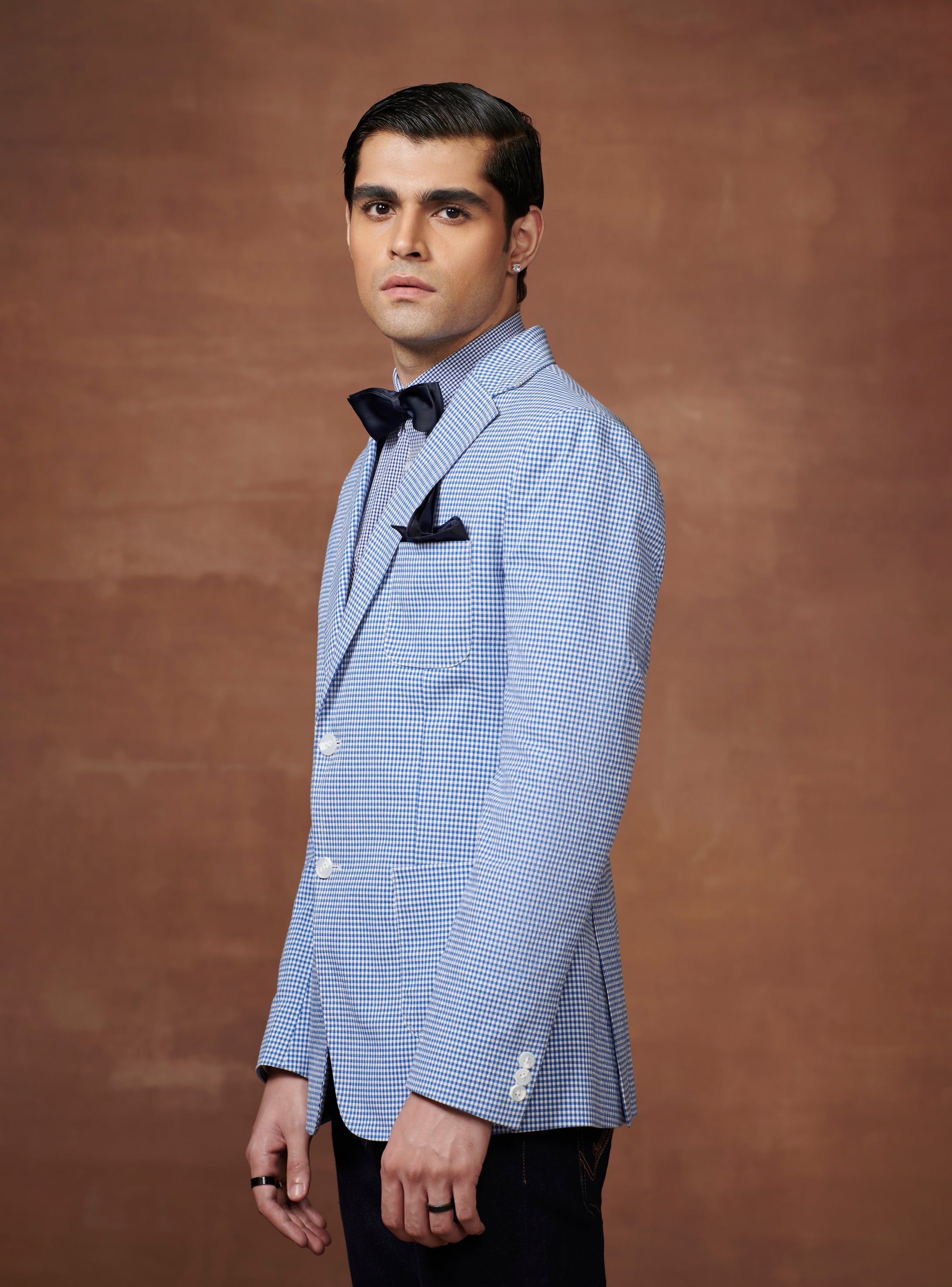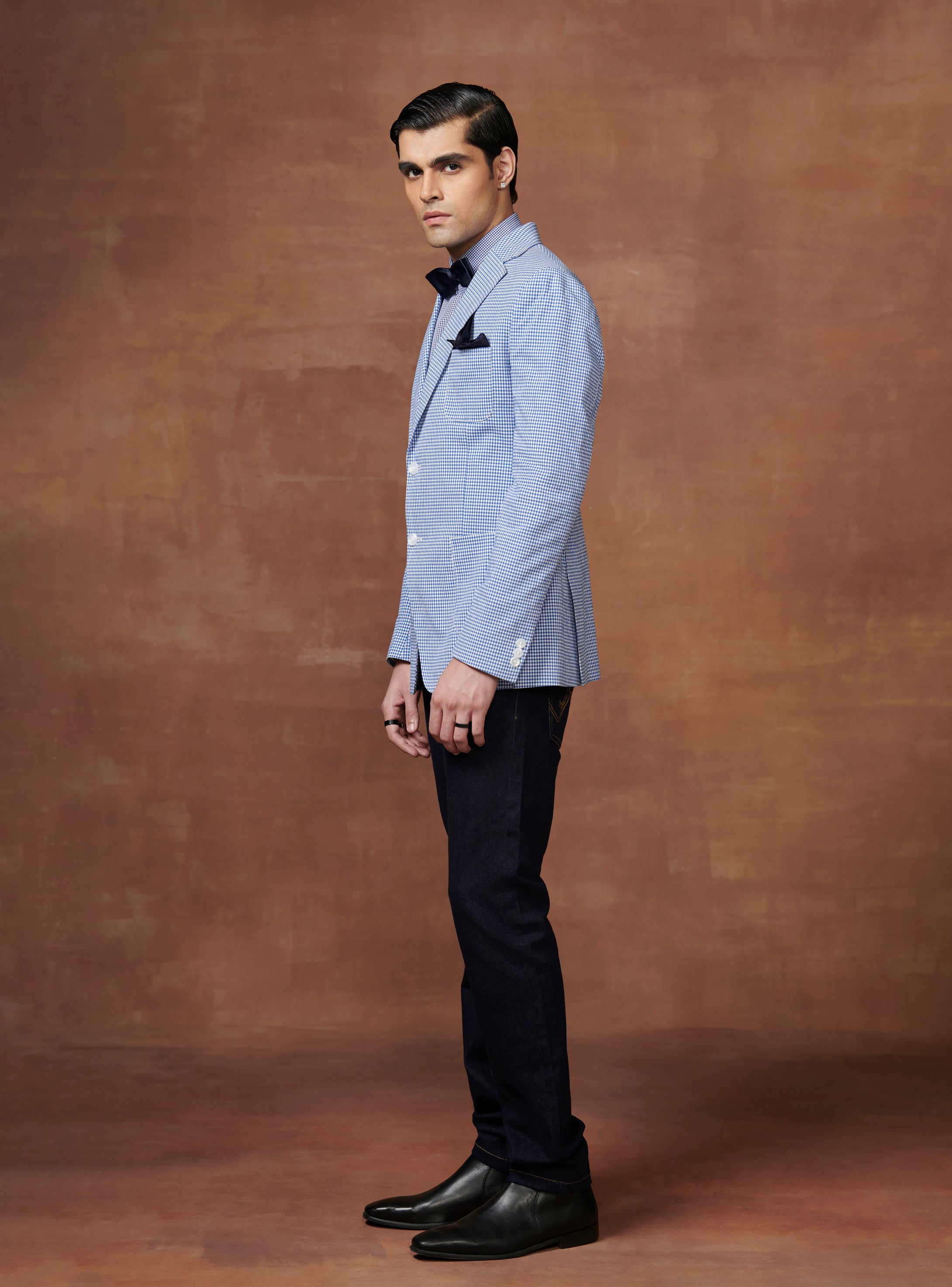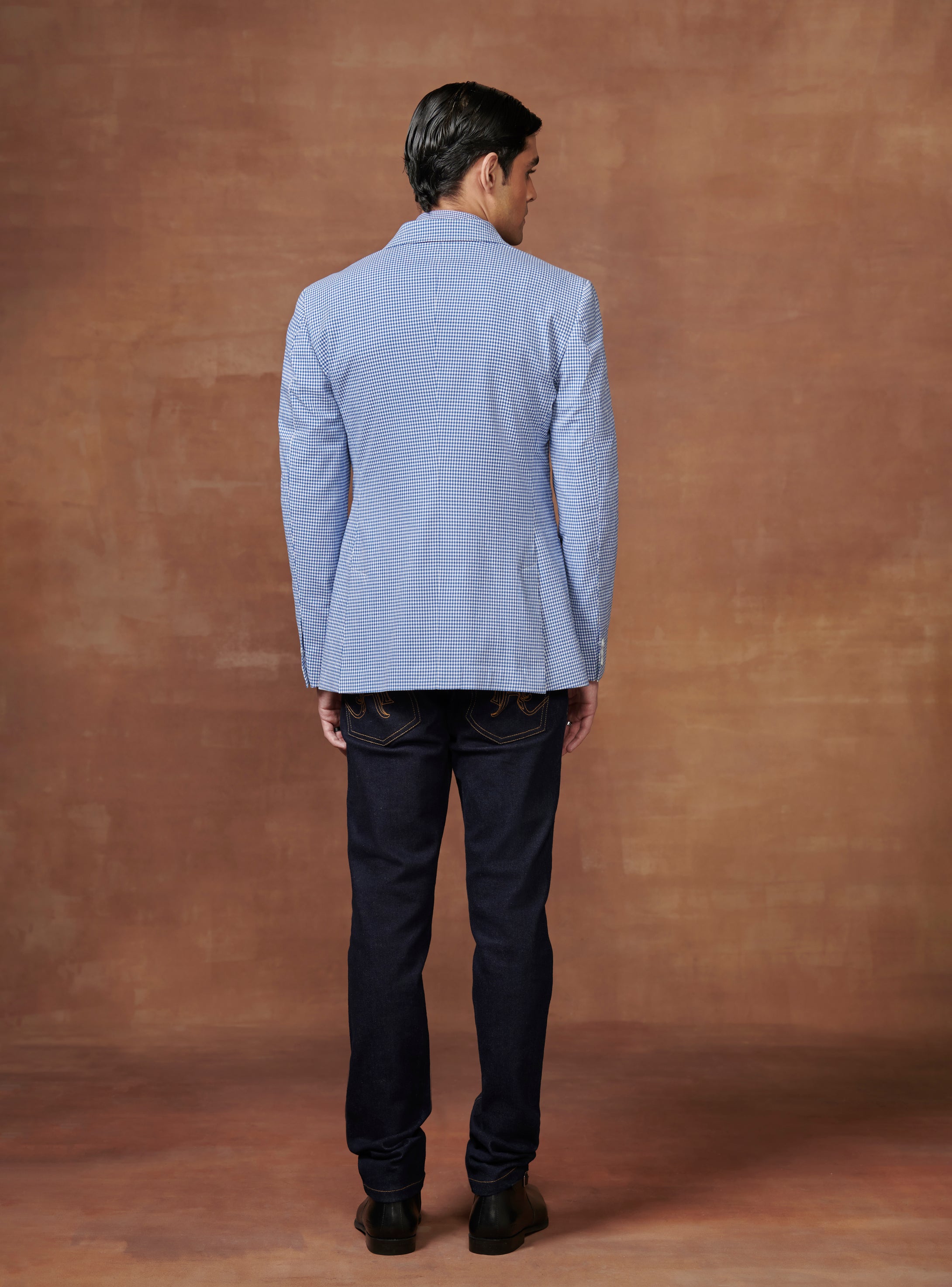 Continue ShoppingLIGHT BLUE AND WHITE CHECK TUXEDO JACKET